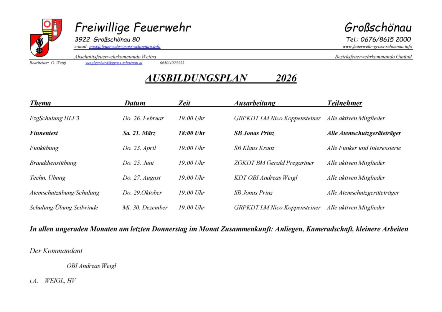 Beim Bezirksfeuerwehrtag am 26.02.2026 wurden Herbert Schaggiger als Abschnittskommandat und Hannes Mülllner als Stellvertreter wiedergewählt.